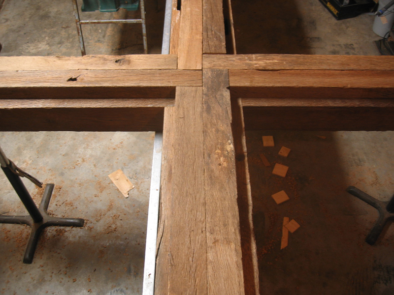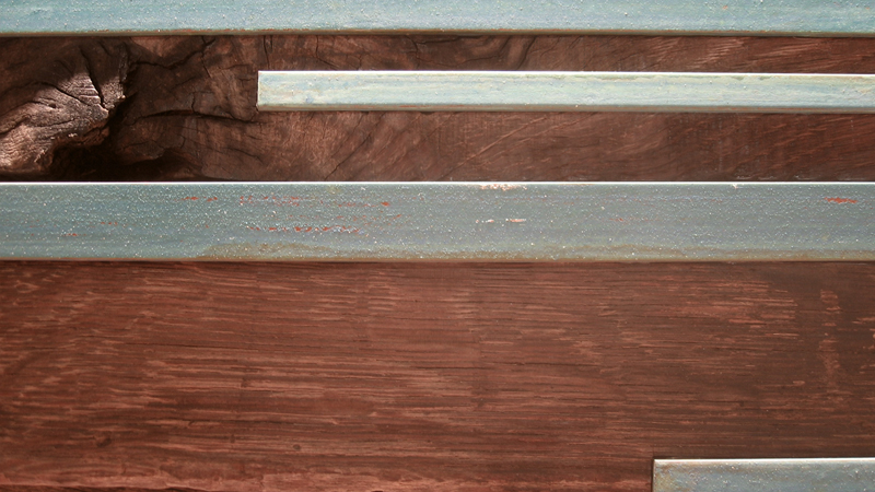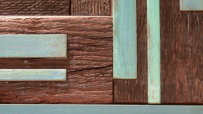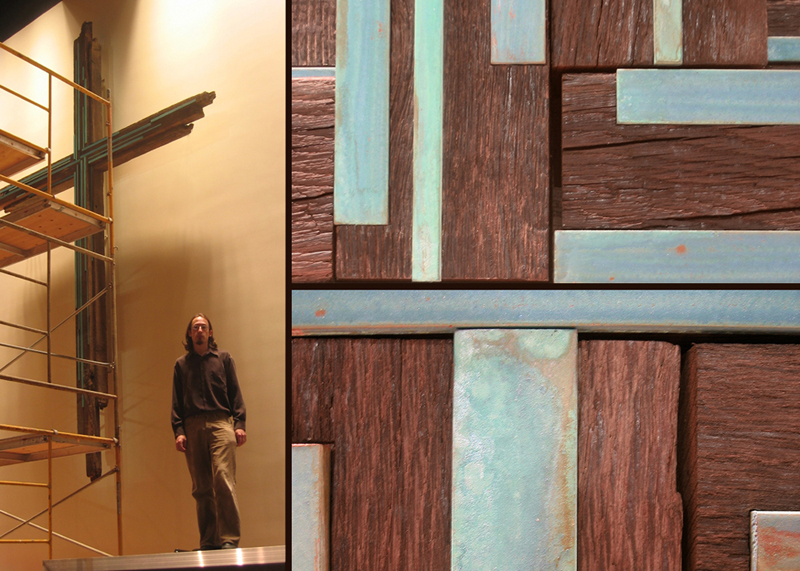 salvaged barn beams, steel internal structure, patinaed copper bars, 2005